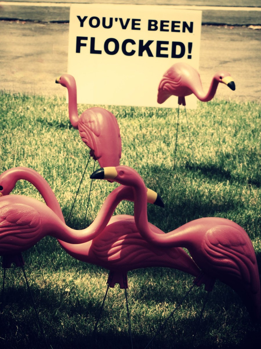 I first spotted them last Monday on my commute to work. I’m lucky enough to be able to take state routes rather than highways, so my route to work takes me through the downtown area of the two towns between home and the office. So, while doodling down main street, I saw them: a cheerful grouping of plastic pink flamingos and a sign reading “You’ve been flocked”
