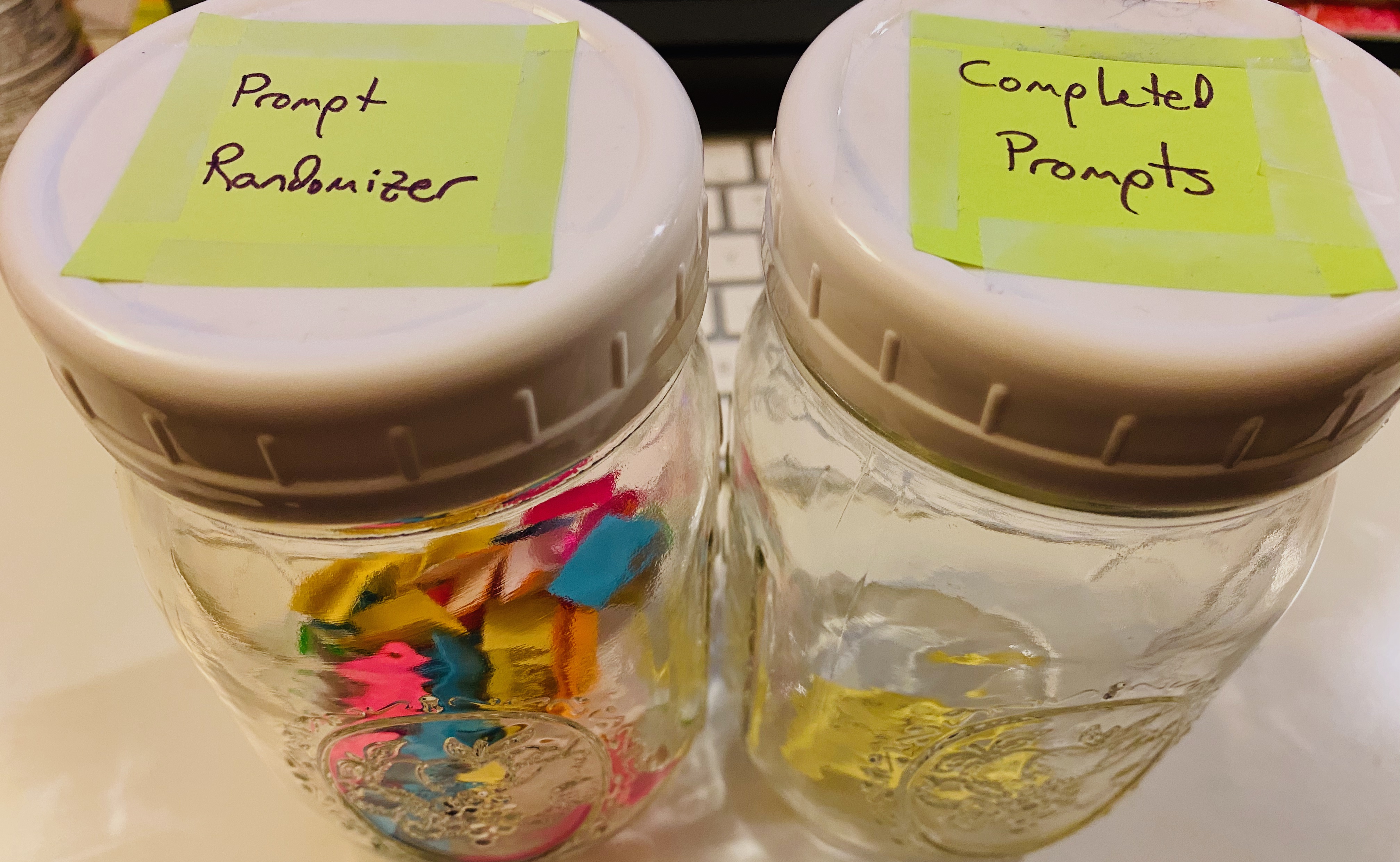 I’m also mixing it up by putting all the prompts into a mason jar so I’ll be drawing them out at random.* And then I’ll toss completed prompts into a second mason jar because brightly colored slips of paper in a glass jar are just so darn pretty.