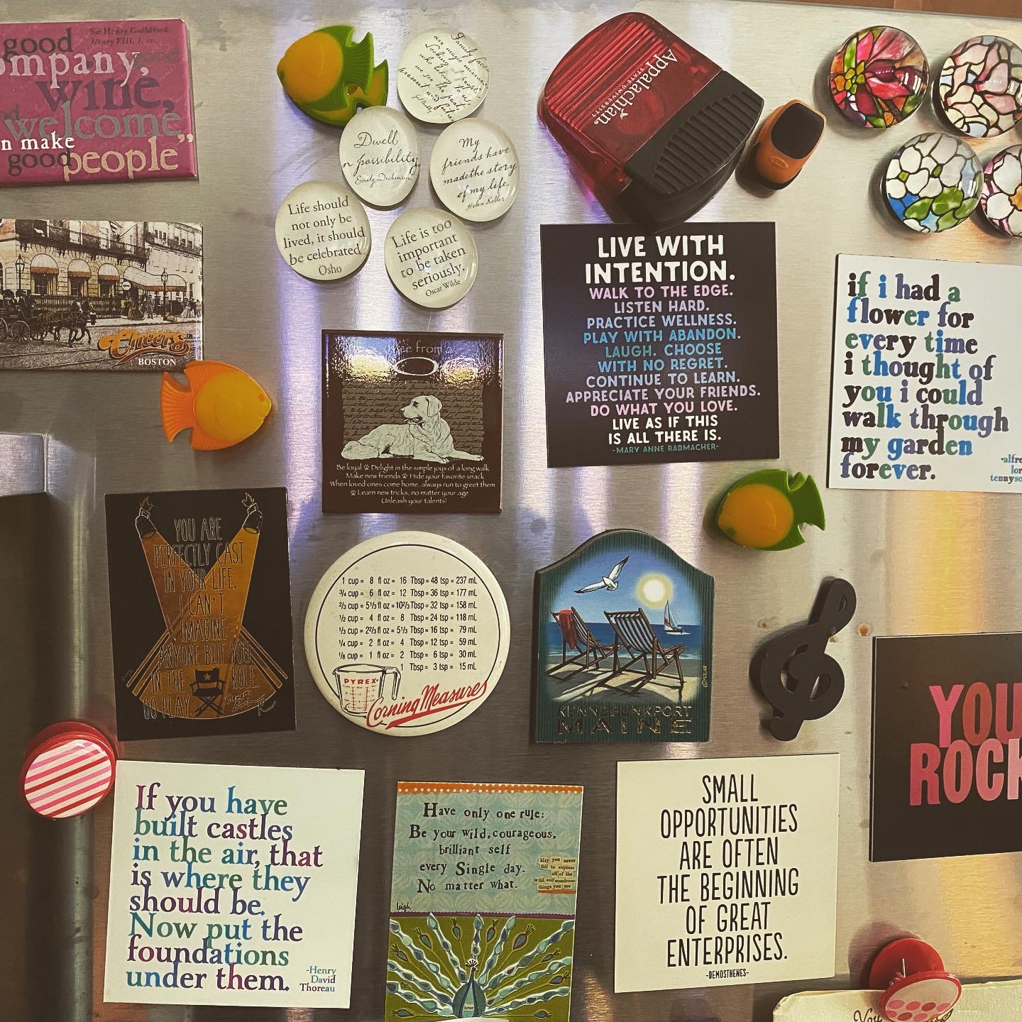 After I posted about this on Instagram and Mr. Mezzo saw it, we quite literally spent 15 or 20 minutes looking at all these magnets—and the ones outside of the camera frame—and reminiscing about the different memories and trips and experiences that they represented in our lives together. Disney. Cirque du Soleil. The Baltic Cruise. Kennebunkport. Skywalker Ranch. Red Sox and Sea Dog games. The university where my uncle used to teach. Hamilton. And then there’s the encouraging words that built up over the years as one or the other of us would, now and again, find a new inspiring magnet to add to the collage: