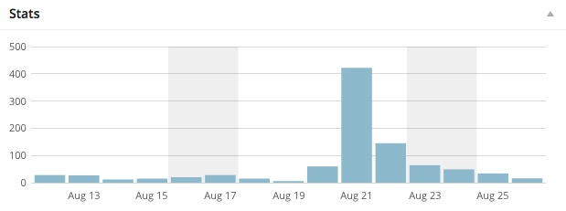 August 20 is when I posted about Ingrid’s experience: you can already see the uptick to 60 site visitors in those hours between hitting “Publish” and midnight, as a few folks started sharing my post within their own networks.