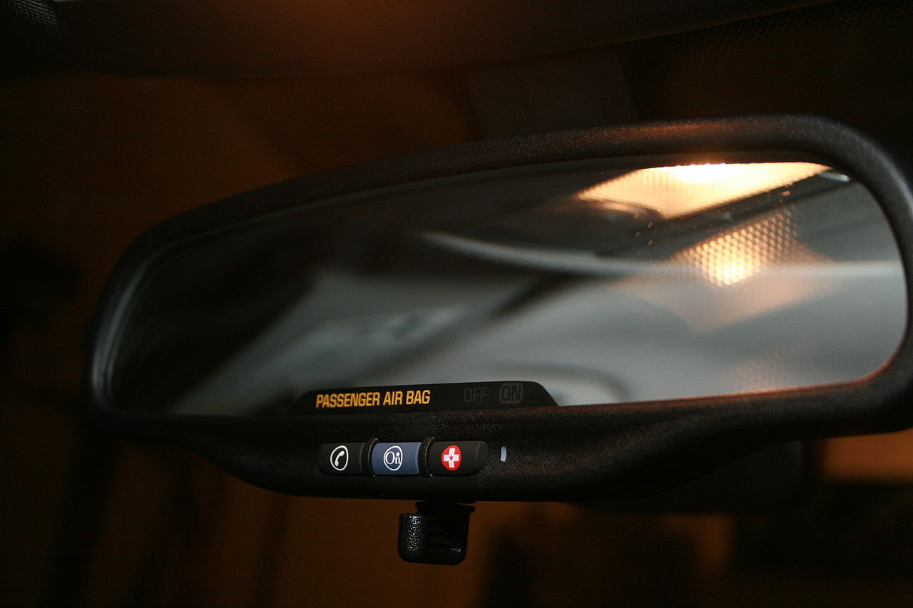 A picture of the 3 OnStar buttons (phone, OnStar and Emergency) built into a rear-view mirror.